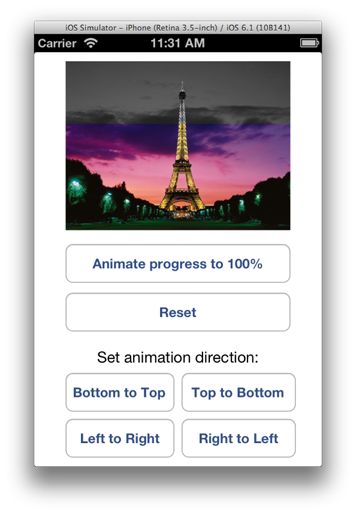 also supports a completion block for animations. This is especially useful for when the progress reaches 1.0, but your application UI shouldn't respond until the progress meter visually reaches completion.