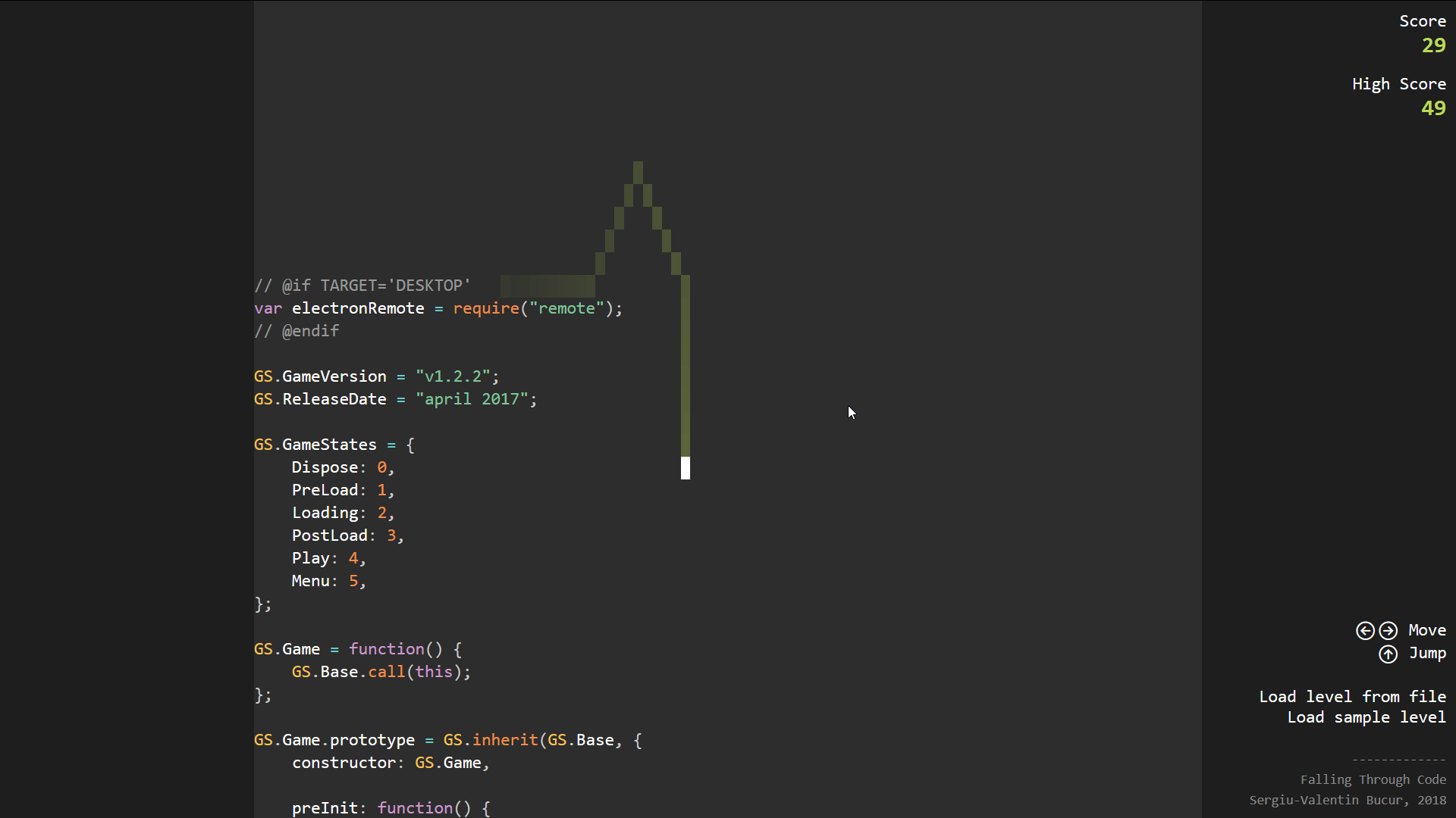 Falling Through Code is a hybrid vertically scrolling game where the levels are source code files.