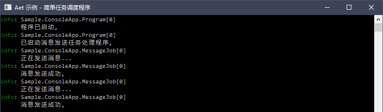 Scheduler.WaitForShutdown();一个简单的消息发送服务就做好了,每隔指定秒数就会执行发送任务。运行后在控制台看到的效果是: