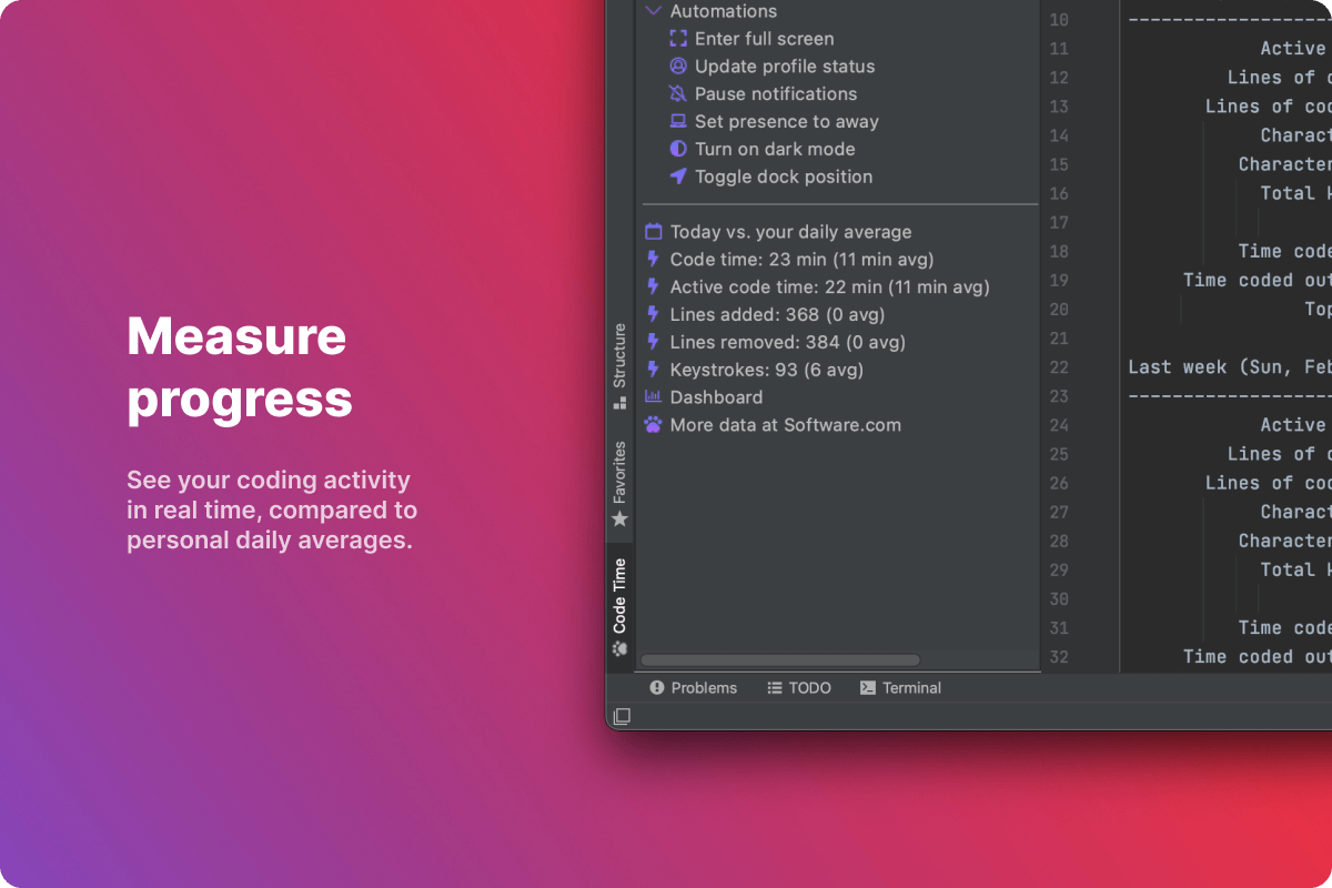 Active code time. Visualize your daily active code time. See productivity trends compared to weekly and monthly averages. See how you stack up against the Software community of over 150,000 developers.
