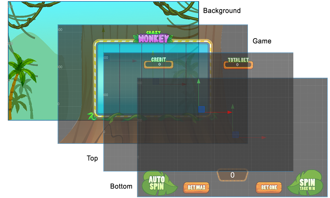 The layout of this node is driven by a widget with constraints on the top, bottom,right and left. - Game layer: this node can be described as the reels container.