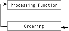 Above figure shows a very high-level overview of the Abstract Graph Machine. A graph kernel in AGM is expressed as a function and an ordering. The processing function takes a WorkItem as an input and produces zero or more WorkItems. The definition of a WorkItem can be based on vertices or edges. More concretely an AGM for a particular graph kernel is defined with the following: