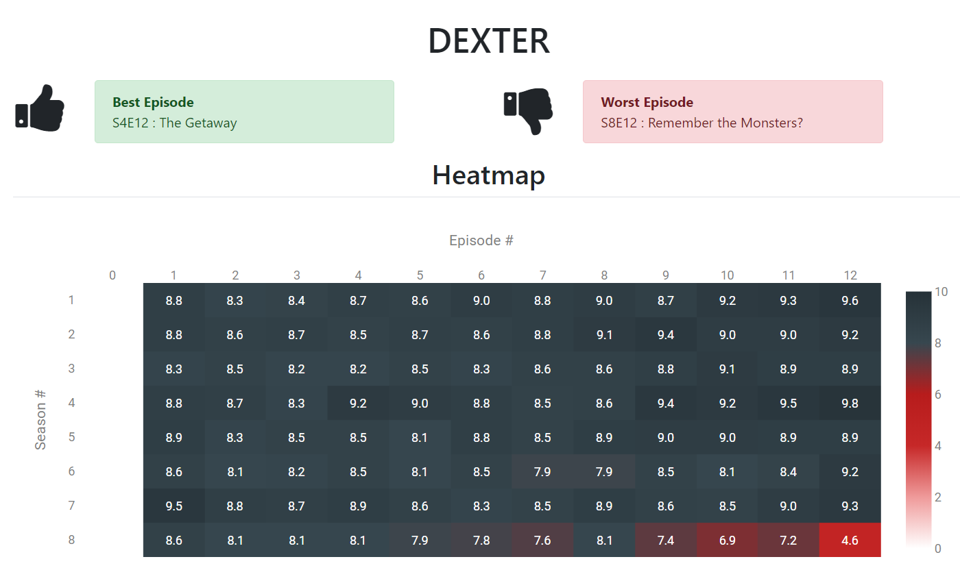 An app to display insights for a tv show such as heatmap, trend line, best episode, worst episode etc. Have suggestion? Let me know
