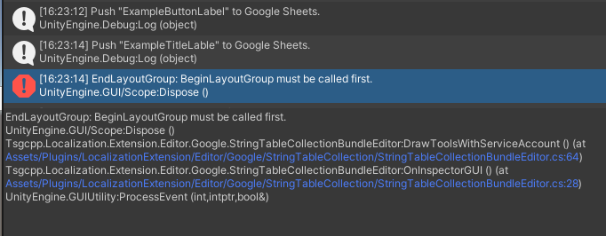 # How to reproduce - Click "Pull All Locales" or "Pull All Locales" in StringTableCollectionBundle inspector This issue does not affect the pulling and the pushing. # How often Sometimes but not always # Screenshots