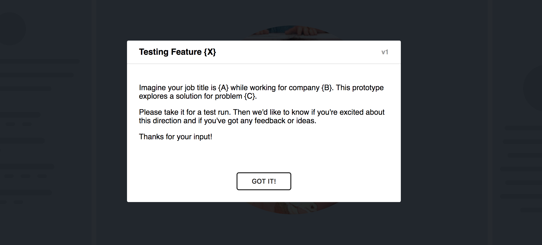 <p>Imagine your job title is {A} while working for company {B}. This prototype explores a solution for problem {C}.</p>
