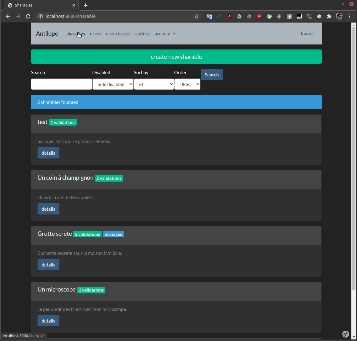 The whole idea behind Antilope, is to transpose the private tracker system to anything else but torrents. Sharables are the key concept of Antilope : they are a the unit of what you can share.