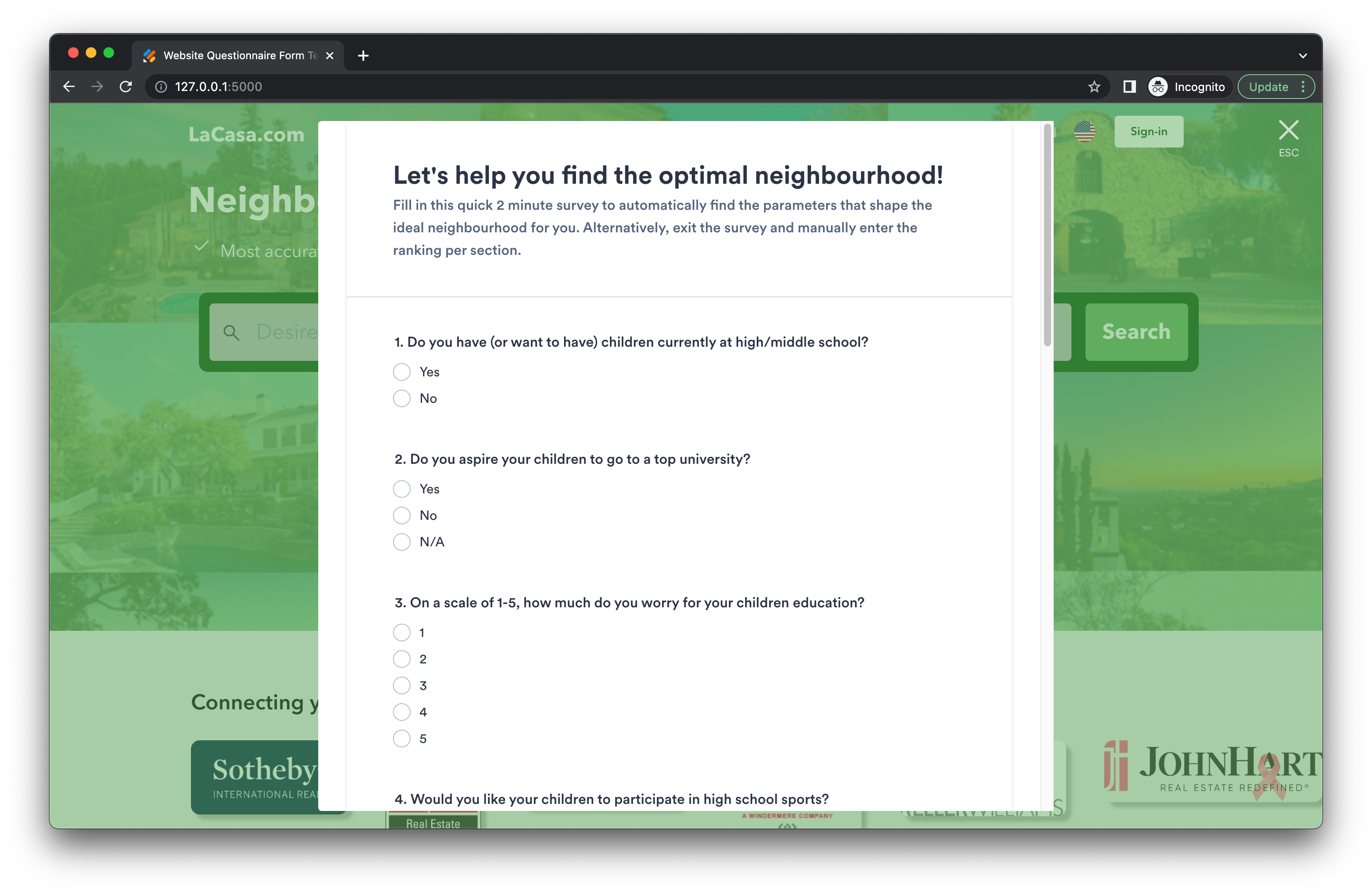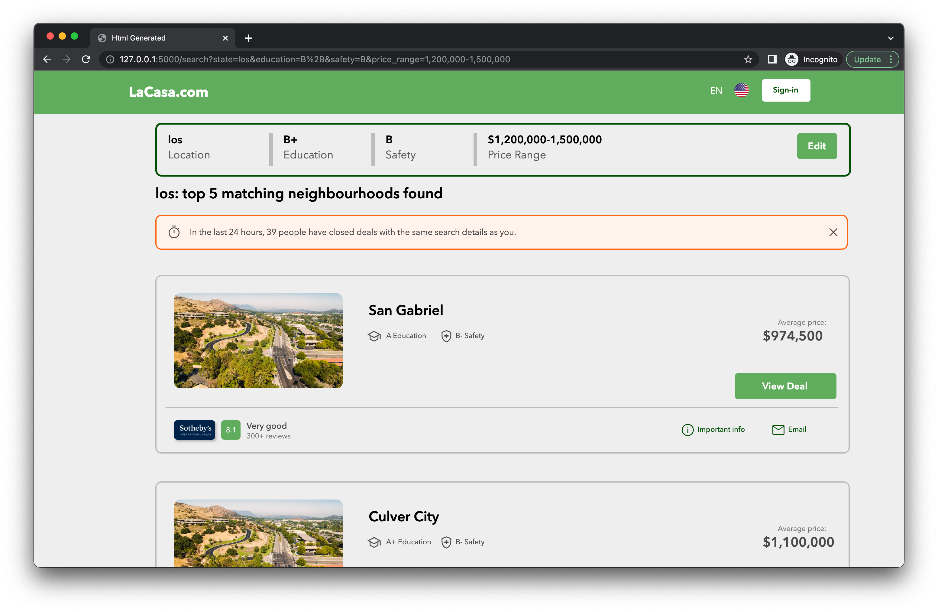 We came up with LaCasa, an app that helps you find the ideal neighbourhood using mainly Binary Trees and Heap-queues by assigning rankings to key attributes to filter and find the ideal neighbourhood. These rankings were based upon conclusions reached from user surveys and other research. So far, the algorithm uses Education, Safety and Price range as attributes for determining the ideal neighbourhood.