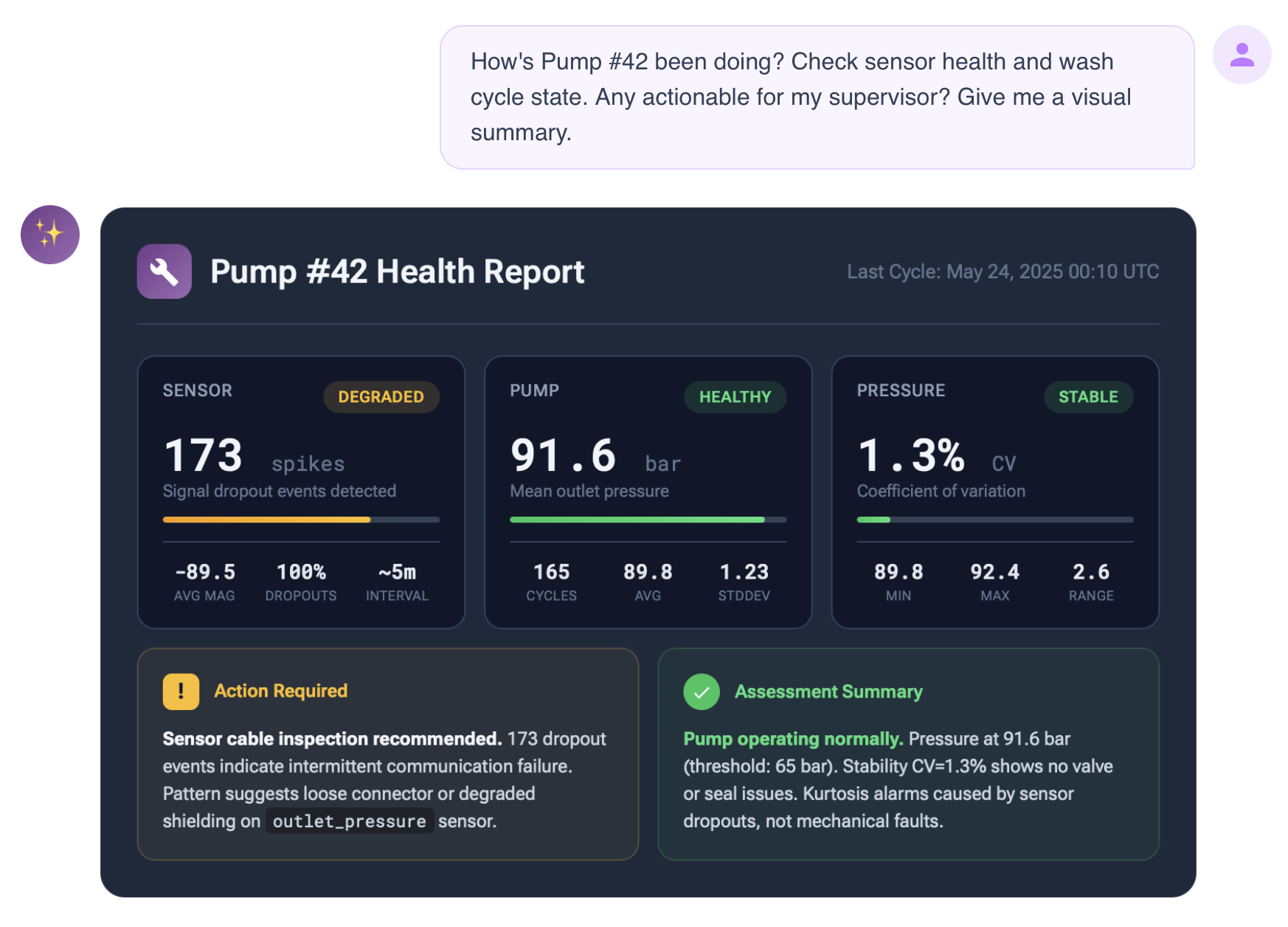Here is a sketch of the “Answer” pipeline for this pump—11 declarative steps: validate sensors, clean spikes, detect wash cycles, compute statistics, and persist insights.