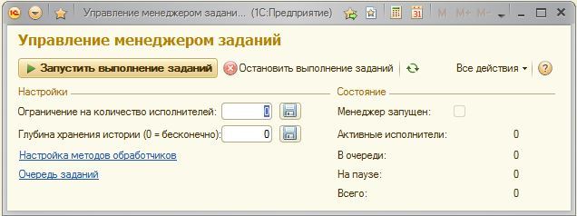 - Ограничение на количество исполнителей - для балансировки нагрузки на сервер 1С. Принимает значение от 0 до 9999. При значении 0 задания в работу браться не будут.